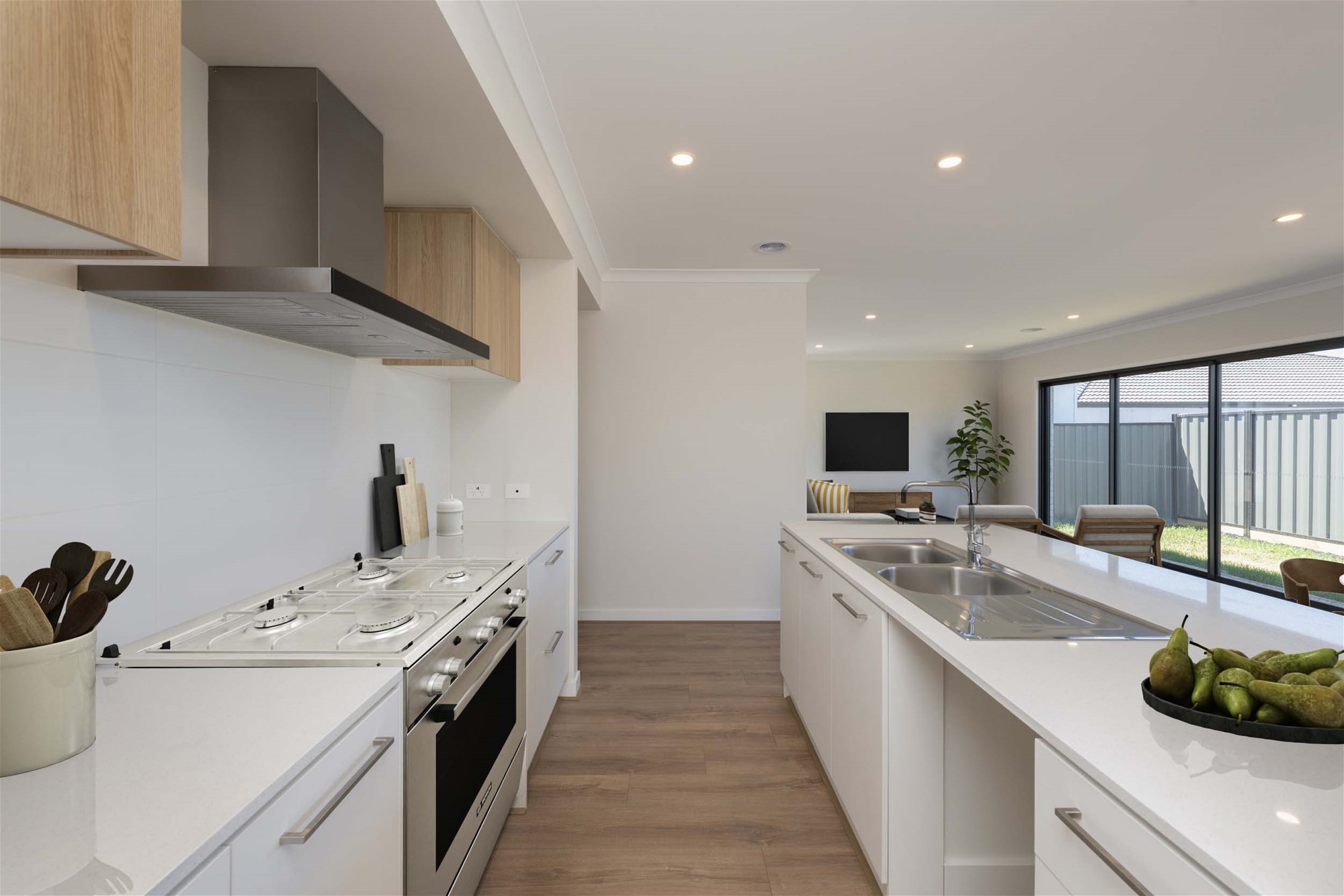 Galley-style kitchen with Fisher & Paykel appliances – Fridge included